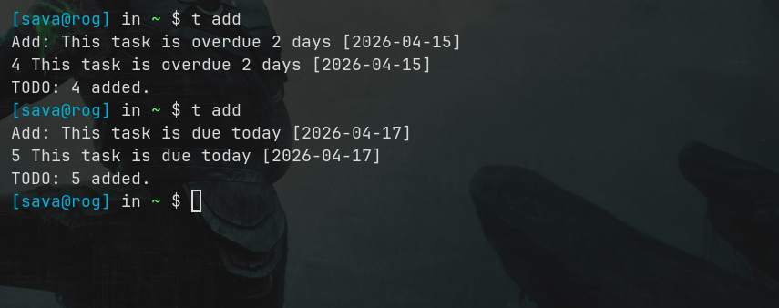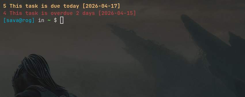 As you can see, whenever I fire up a new terminal tasks overdue are shown in red and today's tasks are shown in yellow.